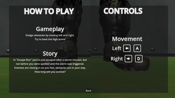Escape Run is just another endless runner game. This prototype was mainly for me to learn more about working with 3D models, animating, and processing information from files, this game features a rudimentary save game system, which logs the players highest 10 scores to act as an offline scoreboard.